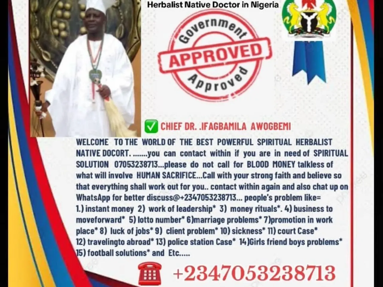 I am Chief Dr Ifagbamila Awogebemi a Native Doctor Herbalist Of ijebu Land solve all problem and If you need any kind of spiritual power, am here to solve all your following problems